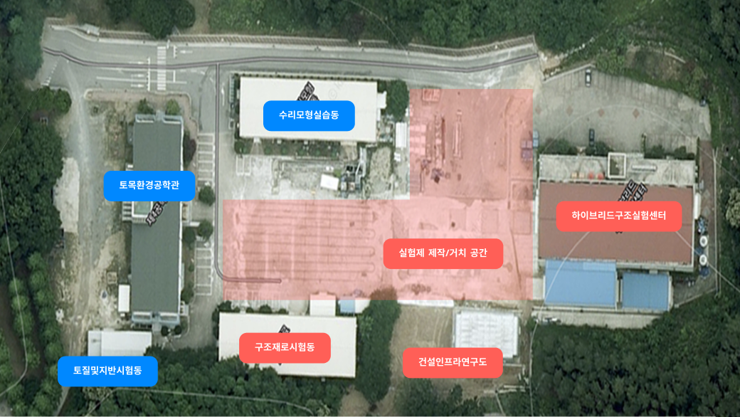하이브리드구조실험센터를 중심으로 약 100m 이내에 “구조재료시험동” 및 “건설인프라연구동” 위치